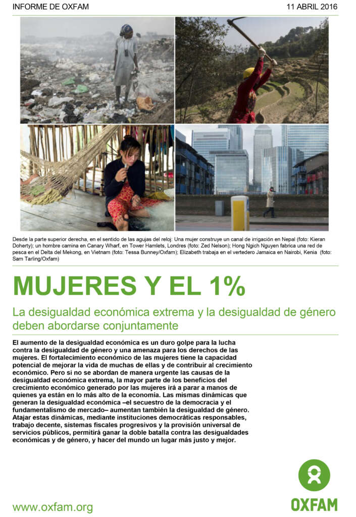 El aumento de la desigualdad económica es un duro golpe para la lucha contra la desigualdad de género y una amenaza para los derechos de las mujeres. El fortalecimiento económico de las mujeres tiene la capacidad potencial de mejorar la vida de muchas de ellas y de contribuir al crecimiento económico. Pero si no se abordan de manera urgente las causas de la desigualdad económica extrema, la mayor parte de los beneficios del crecimiento económico generado por las mujeres irá a parar a manos de quienes ya están en lo más alto de la economía. Las mismas dinámicas que generan la desigualdad económica –el secuestro de la democracia y el fundamentalismo de mercado– aumentan también la desigualdad de género. Atajar estas dinámicas, mediante instituciones democráticas responsables, trabajo decente, sistemas fiscales progresivos y la provisión universal de servicios públicos, permitirá ganar la doble batalla contra las desigualdades económicas y de género, y hacer del mundo un lugar más justo y mejor.